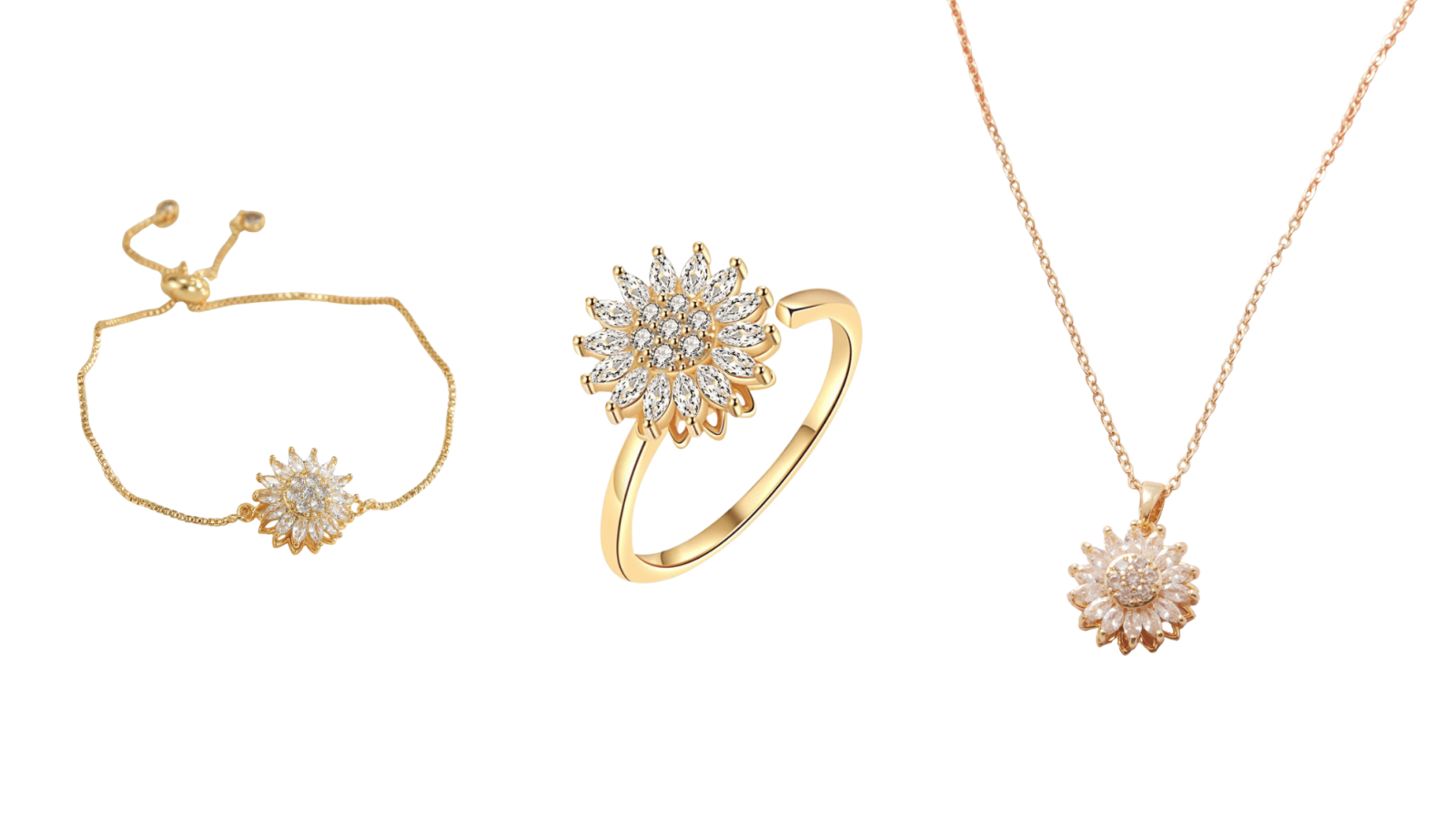 Set Gold include Colierul, Inelul si Bratara Rotativa Anti-stres Aurii.